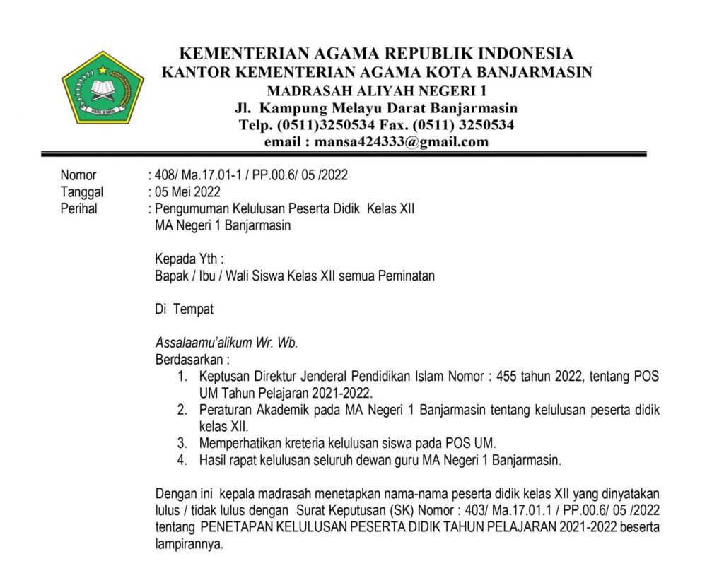 PENGUMUMAN KELULUSAN PESERTA DIDIK MA AlHamid Banjarmasin