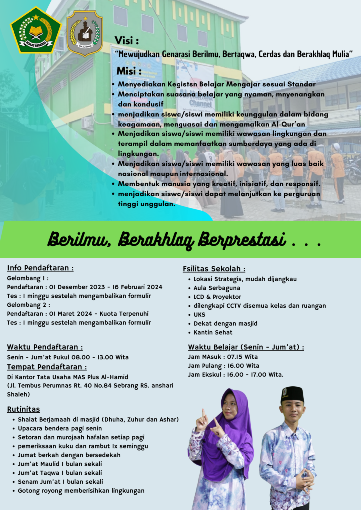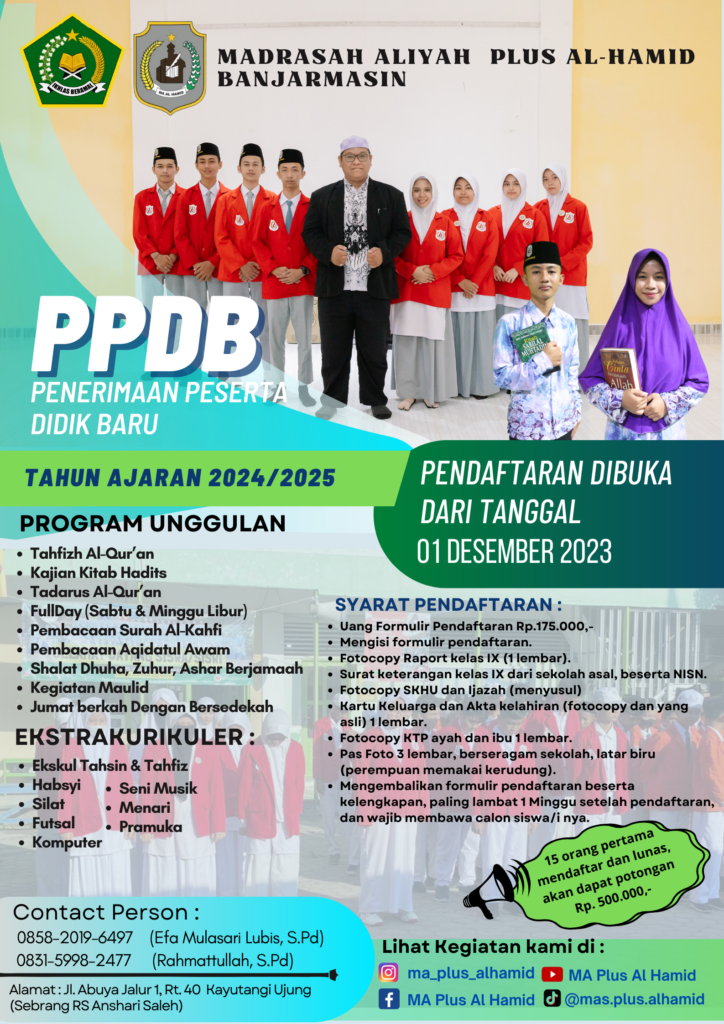 Banjarmasin, 2 November 2023.- MA Al-Hamid Banjarmasin membuka penerimaan peserta didik baru (PPDB) Tahun ajaran 2024-2025. Berdasarkan hasil rapat Panitia PPDB tanggal 2 November 2023, PPDB tahun ini dibuka dari tanggal 1 Desember 2023 mendatang.